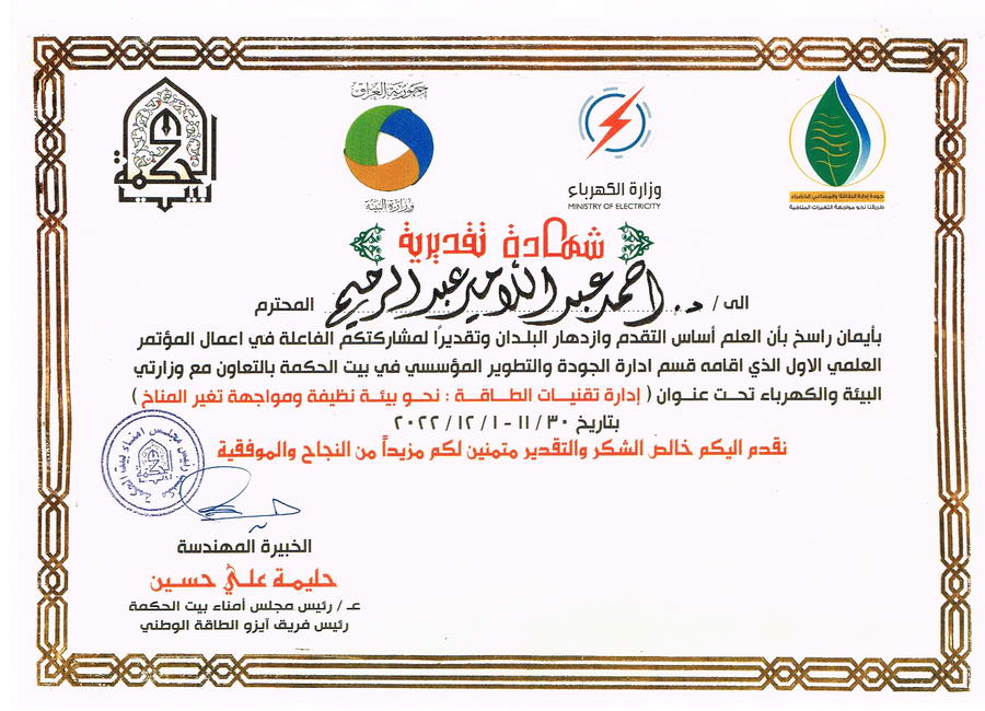 شارك مدير قسم إدارة الجودة الشاملة والتطوير المؤسسي الدكتور أحمد عبد الامير عبد الرحيم ممثلا عن الديوان، في المؤتمر العلمي الاول للمبادرة الوطنية المعنون (إدارة تقنيات الطاقة نحو بيئة نظيفة ومواجهة تغير المناخ) الذي اقامه بيت الحكمة بالتعاون مع وزارتي البيئة والكهرباء للايام 30/تشرين الثاني-1كانون الاول /2022.