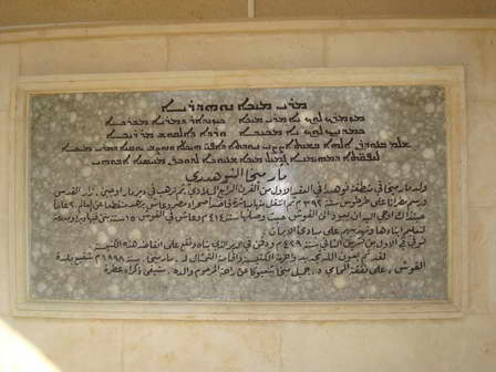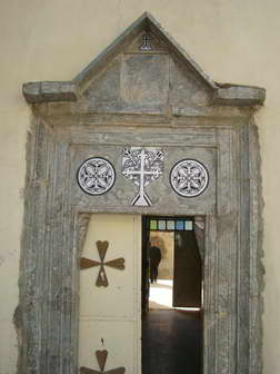 يوجد باب صغير ضمن حائط يطل على الممر الذي يمتد على طول الواجهة الغربية للكنيسة.